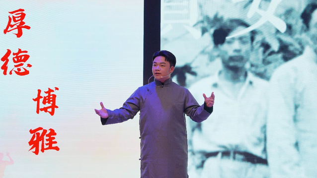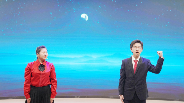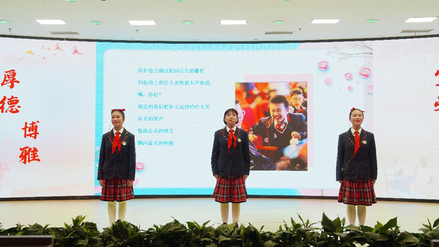 来自华中师大一附中卓越书院八年级和高一年级的学子们以标准的普通话和饱满的情感深情演绎了多部经典作品。从描绘壮丽山河、抒写家国情怀的《读中国》《我用残损的手掌》,到意境悠远、充满希望的组诗《春江花月夜》《初春》;从革命领袖毛泽东气吞山河的《念奴娇·昆仑》《浪淘沙·北戴河》《卜算子·咏梅》,到学生原创诗歌《青春与少年》,再到充满浩然正气的《最后一次讲演》,学子们用声音勾勒出经典诗文的意境,生动传递出其中蕴含的文化底蕴与精神力量,深深打动了在场的每一位观众。